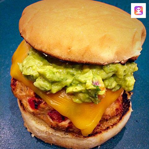 This is a very tasty chicken burger with lime juicecilantro tomato topped with fresh guacamole and cheddar cheese.